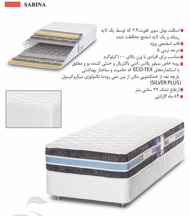 ◀️ در تشک سارینا با به کارگیری تکنولوژی فنر های بونل 2.4 تن آسای قابلیت حفظ فرم و شکل تشک را برای مدت زمان طولانی دارا می باشد.